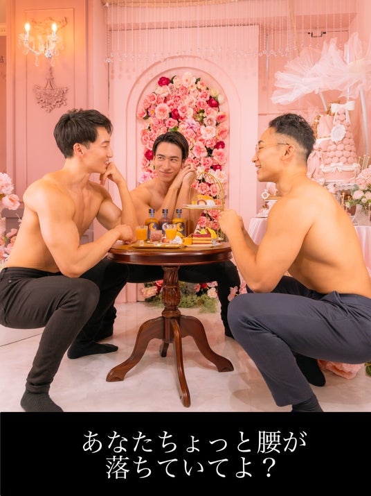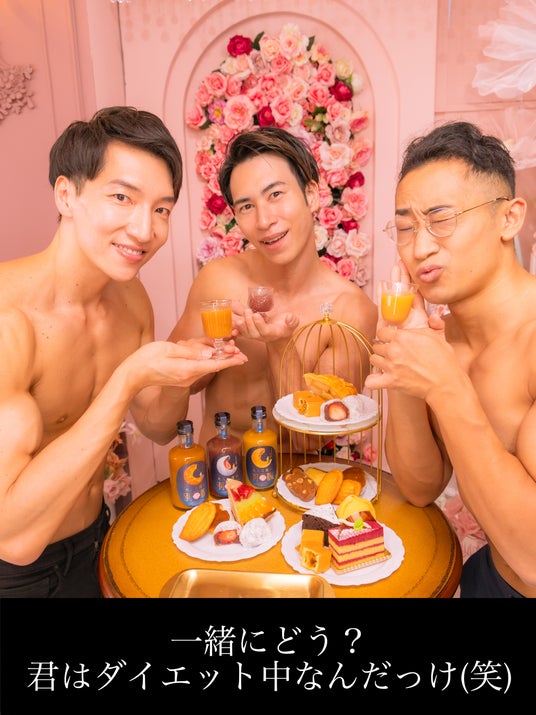 可愛いお花やスイーツに囲まれたメルヘンな雰囲気の中で、上半身裸のマッチョたちがアフタヌーンティーを楽しむという、ちょっと可笑しなギャップのある世界観をお楽しみください。