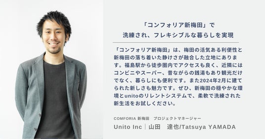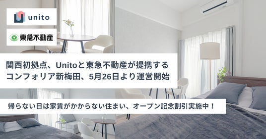 株式会社Unito(本社:東京都千代田区、代表取締役:近藤 佑太朗、以下Unito、読み:ユニット)は、東急不動産株式会社(本社:東京都渋谷区、代表取締役社長:星野 浩明、以下東急不動産)と提携し、東急不動産の手掛ける賃貸レジデンスブランド「COMFORIA(コンフォリア)」(以下コンフォリア)ブランドにUnitoの独自システムである「帰らない日は家賃がかからないリレント」の仕組みを導入した物件「コンフォリア新梅田」の運営を開始します。