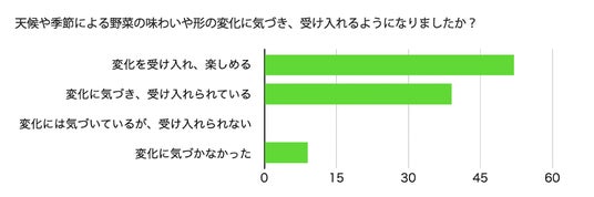 本調査では、「変化を受け入れ、楽しめる」「お野菜の変化に気づき、受け入れられている」の回答が全体の91%を占めており、坂ノ途中が提案しているライフスタイルが定着しているという結果が得られました。この積み重ねが、有機農業など環境負荷の小さい農法で栽培された農産物の消費を促し、生産者の経営改善や農業の持続可能化につながると考えています。