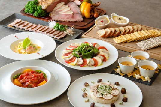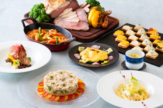 北海道産モッツァレラと自家製テリーヌの盛合せ、豚のレバーペースト 鶏のレバーペースト 食べ比べ、舟形マッシュルームのゴルゴンゾーラリゾット、牛肉のオレンジ煮、北海道産ホワイトコーンのフラン、岩手県産鶏肉の低温調理 スペルト小麦とキャベツのクリーム煮を添えて、ノルウェーサーモンと北海道産枝豆のレモンクリームパスタ、西京味噌仕立てのローストポーク 香味野菜添えなど。その他、定番人気のローストビーフや窯焼きピッツァ、にぎり寿司を含む約60種類。<6/29・30限定メニュー>