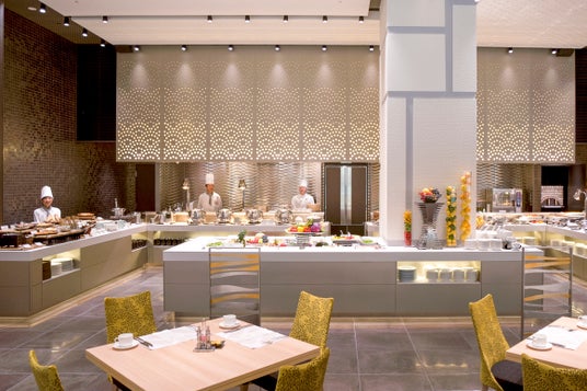 天井が高く開放的な店内で、こだわりの料理を思う存分お召し上がりいただける「ベルテンポ」のブッフェ。