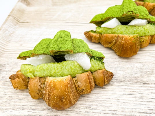 「ずんだ抹茶クロワッサン」抹茶のクロワッサン生地にずんだあん、求肥をのせて仕上げに抹茶パウダーを振りました。初夏の季節感を表現しています。一見ノーマルのクロワッサンに見えて食べ進めると抹茶の断面が見えてきます。