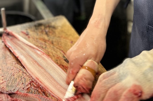 萬鰻亭にはうなぎを捌く専門の職人”鰻師”がいます。厳選された活きたままのうなぎを、当日の朝、鰻師が捌いていきます。関西包丁で素早く腹開きにし、丁寧に串を打っていきます。うなぎの調理と言えば厳しい修行のイメージが強いですが、それも昔の話。萬鰻亭ではわかわりやすい技術指導と実際の捌きを徹底して経験してもらうことで、未経験でも半年以内に捌けるようになっています。
