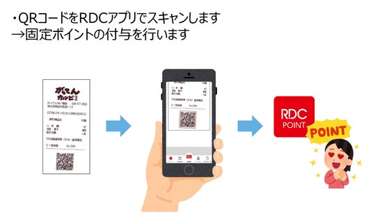 2024年6月上旬より、対象容器回収でポイント付与のサービスを開始いたします。お客様が店舗へ対象容器をお持ちいただくと、容器のポイントに応じてQRコードを作成いたします。そのQRコードを、RDCグループアプリでスキャンをして、ポイント付与を行ってください。