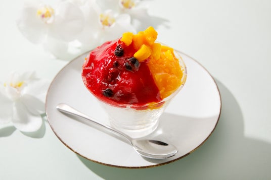 マンゴーとミックスベリーのソースをかけたシェイブアイスにマンゴーとベリーをトッピング。