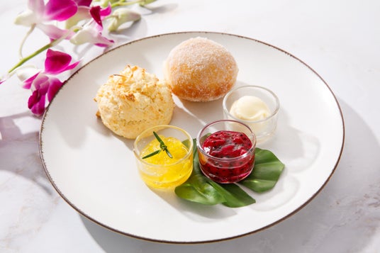 〈スコーン〉マラサダ 、ココナッツスコーン(コンディメント:クロテッドクリーム、ピタヤソース、パイナップルジャム)