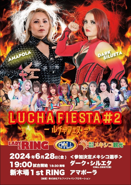 ルチャリブレ(Lucha Libre)とは、スペイン語で「自由な戦い」を意味するメキシカンスタイルのプロレス。先だって5月27日に行われた記者会見では、王者シエルタ、ウナギ・サヤカ、向後桃が出席。向後桃はセミファイナルに登場し、シエルタとウナギはメインイベントCMLL日本女子選手権で激突する。