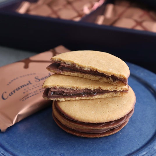 北海道美瑛小麦を使ったクッキーから、キャラメルソースを包んだなめらかなショコラがとろりなリッチな味わい。
