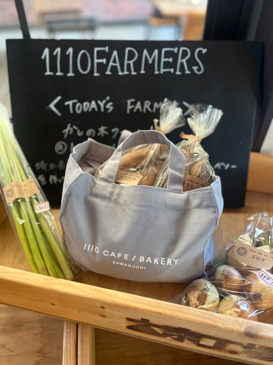 1110 CAFE/BAKERYオリジナルトートバッグに、提携している農家さんからの新鮮野菜をランダムに詰めた「1110 HAPPY BAG」を1500円(税込)で、1日5点限定で販売します。トートバックはちょっとしたお散歩や、カフェでのお買い物にピッタリなサイズのマチ付トートバックです。そのままお買い物袋としてお使い頂けます。