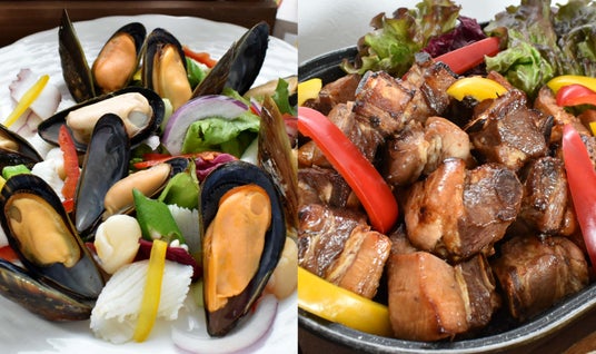 左 シーフードのセビーチェ、右 骨付き豚肉のバーベキュー