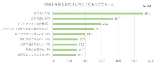 ・「緑茶」を飲むシーンでは「リフレッシュ(気分転換)」が「リラックス(気持ちを落ち着かせたい)」を上回る
