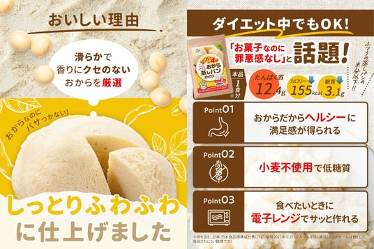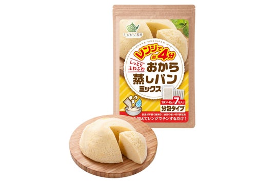 こうした背景から、1食分のミックス粉を個包装にすることで、調理工程の大幅な簡略化を実現する商品「おから蒸しパン」が生まれました。本品に卵と水を加えてよく混ぜて電子レンジで加熱するだけで、しっとりふわふわの蒸しパンが出来上がります。