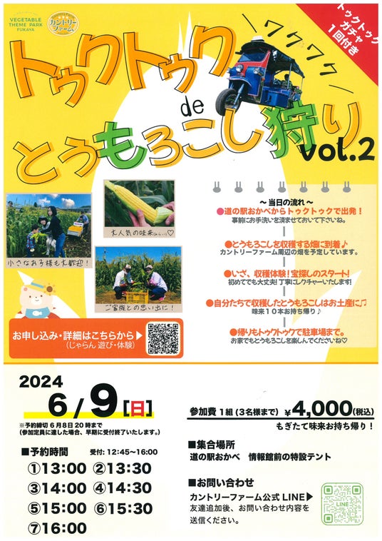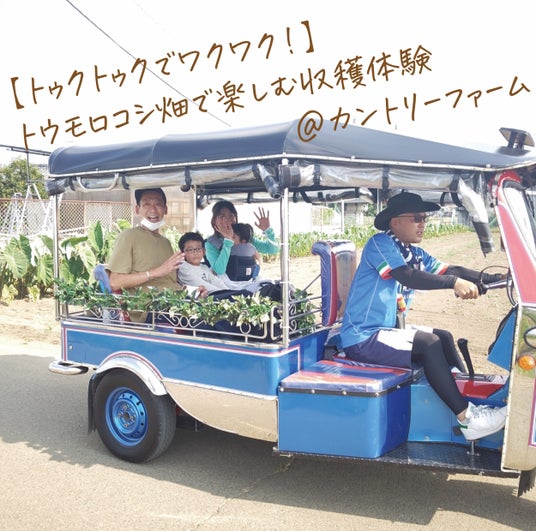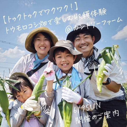 TukTukでワクワク☆ とうもろこし畑で楽しむ収穫体験(9日のみ) @カントリーファーム https://www.jalan.net/kankou/spt_guide000000221885/activity/l000055C13/ →お問い合わせは(カントリーファームへ) <お申込みページ内<メールする
