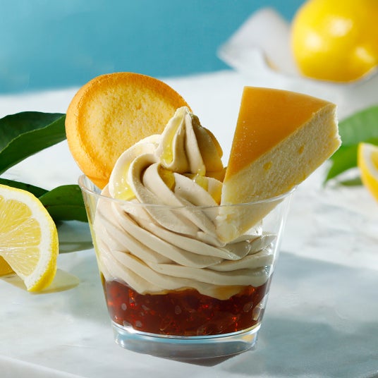 チーズケーキ風味のソフトクリームにチーズケーキとチーズクッキーをのせたサンデーシリーズから、季節限定フレーバー『チーズケーキサンデーレモン』が登場します。コクが特長のアッサム種を使用した紅茶ゼリーに、ベイクドチーズケーキの風味がお楽しみいただけるチーズケーキソフトを重ねました。上には季節限定フレーバー『御用邸レモンチーズケーキ』と『御用邸レモンチーズクッキー』をあわせ、最後にレモンピール入りのソースとレモンパウダーをトッピングした、レモンの美味しさがまるごと楽しめるサンデーです。レモンの爽やかさやさっぱり感はもちろん、最後にトッピングしたレモンパウダーの酸っぱさが絶妙にマッチした、暑い時期にも食べやすいスイーツです。