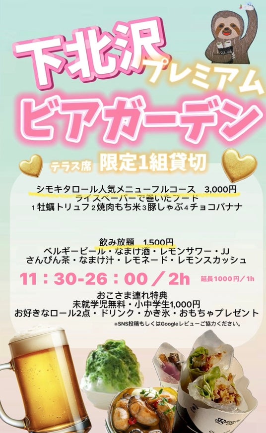 才能発信型飲食店 「Roll Sloth?」の一号店である下北沢店にて、この夏限定のプレミアムビアガーデンがオープンします。