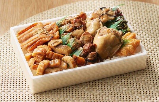 蒸しかき、味付けかき、煮穴子、焼き穴子。瀬戸内の海の幸を贅沢にのせました。