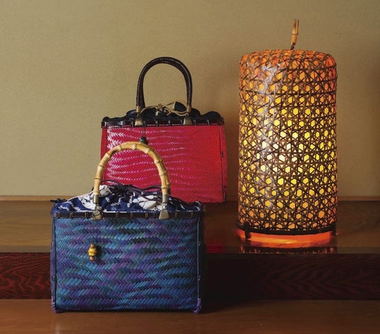 [愛媛]「竹工房テラヤ」(左)竹バッグ(赤・青)(横20×縦28×マチ9cm)各85,000円、(右)ランプシェード 42,000円[いずれも現品限り]