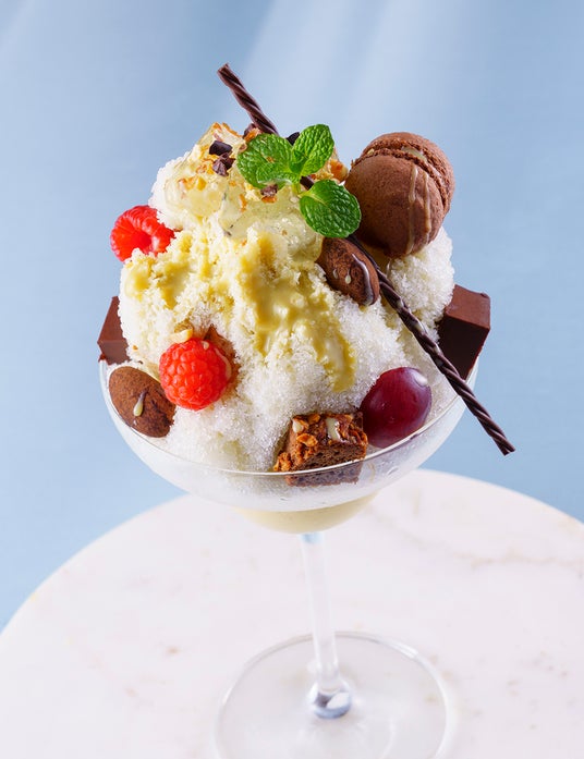 そして、ピスタチオと練乳のソースやアングレーズソースの濃厚な味わいを纏った「ピスタチオのかき氷 パフェ仕立て」は、別添えで提供のフルーツ、生チョコレート、マカロンやブラウニーなどをご自身で自由にトッピングしてお召し上がりいただきます。