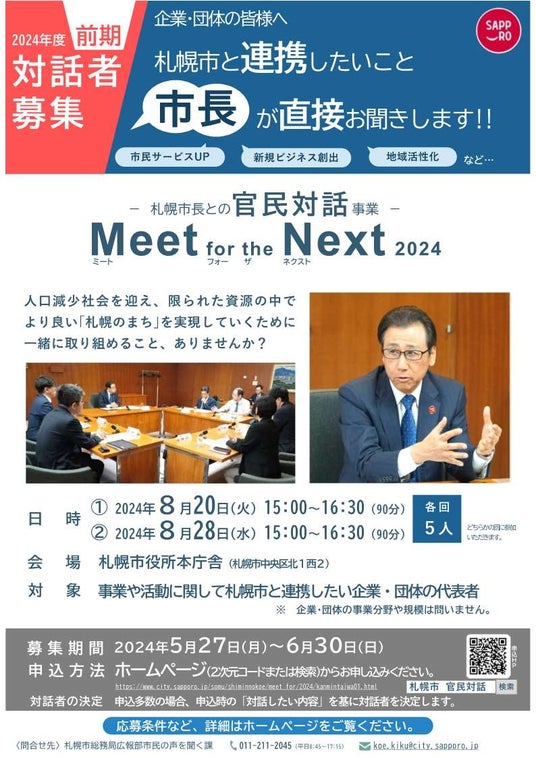 新しい「官民連携」を共に創っていくため、札幌市長がさまざまな企業・団体の代表者等と意見交換を行う官民対話事業「Meet for the Next 2024」。現在参加エントリーを受付中です!