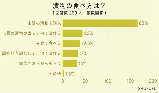 漬物の食べ方に関しては1位「市販の漬物を購入(83%)」、2位「市販の漬物の素で自宅で漬ける(22%)」でした。自分で漬物を作っている方もいますが、多くの方は売っている漬物を購入して食べているようです。