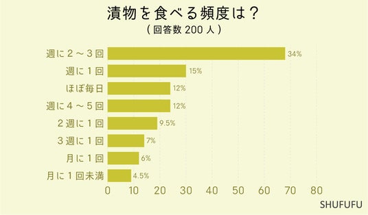 漬物を食べる頻度は?の問いに対して最も多かったのが「週に2~3回(34%)」でした。 次いで「週に1回(15%)」「ほぼ毎日(12%)」という結果でした。70%以上の人が週に1回以上漬物を食べているようです。