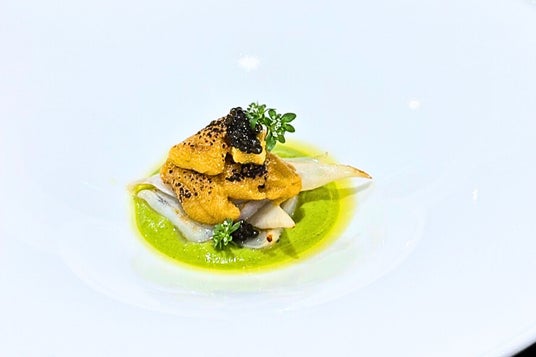 「ウニ、イカ、ズッキーニ、ティエド」(ディナー限定)香ばしく炙ったウニとサッとソテーしたヤリイカ、余市で採れたズッキーニのピューレ、ライムの香りを付けたオイル。