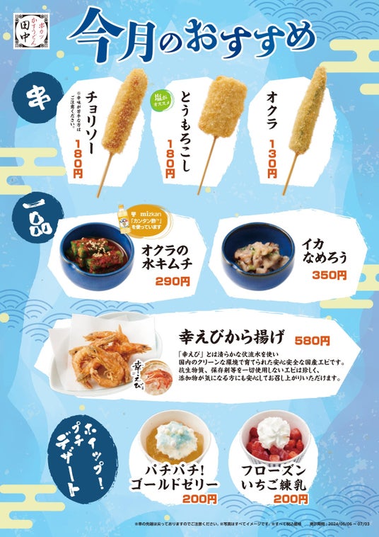 株式会社串カツ田中ホールディングス(本社:東京都品川区東五反田、代表取締役社長:坂本 壽男)が展開する「串カツ田中」は、2024年6月6日(木)より、季節のおすすめとして夏の新メニュー合計11種類の販売を開始します。旬の「とうもろこし」やお酒のおつまみにぴったりな「チョリソー」などの串カツや、国産バナメイエビである幸えび(※1)を使用した「幸えびから揚げ」といった一品メニューもご用意いたします。