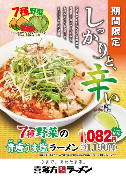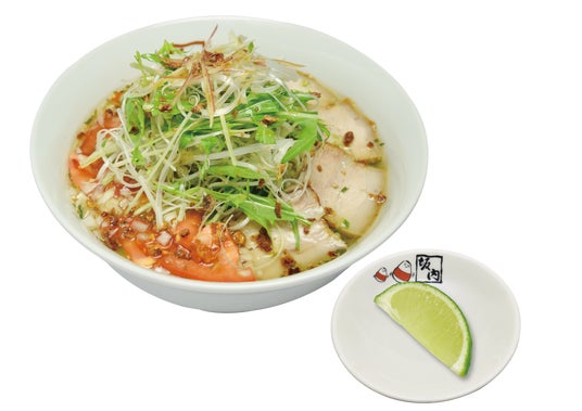 すっきりとした透明な塩スープに青唐辛子のまっすぐな辛さが染み渡り、新鮮な夏野菜との相性がやみつきになる「青唐うま塩ラーメン」は、2008年に季節限定ラーメンとして登場してから、女性を中心に根強いファンを増やしてきました。イタリア料理の「ペペロンチーノ」から発想を経て開発された当商品は、これまでの調理過程では、自家製ラードと刻んだ青唐辛子を混ぜ合わせて炙り、青唐辛子が持つ独特な辛みの角を取り除きながらもじわじわと内側から攻められるような辛さに仕上げておりましたが、今年は辛みがさらにパワーアップ!フレッシュな青唐辛子を自家製ラー油に漬け込んだ“青唐ラー油”を使用し、生まれ変 わって登場します。口に含んだ瞬間から「しっかり」とした辛みを感じ、最初から最後まで刺激的な辛さを感じる今夏の青唐うま塩ラーメンですが、今回の発売からは別添えのライムも一緒にご提供いたします。ライムを搾り、回しかけるとほろ苦い酸味がスープ全体の辛みを和らげ、よりすっきりとした味わいに変化。“2度おいしい”をお楽しみいただけます。キャベツやトマトなど7種の夏野菜は山のようにたっぷりとあしらい、栄養バランスもご安心いただけます。坂内自慢の焼豚は従来の3枚から5枚へトッピングを増やし、さらに満足感を高める一杯に仕上げました。