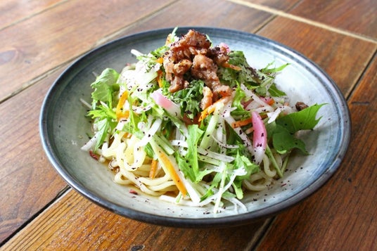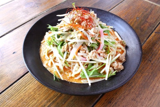胡麻風味の冷たい豆乳ピリ辛スープと冷製もちもち自家製麺を特製肉そぼろとシャキシャキ野菜と一緒にどうぞ。