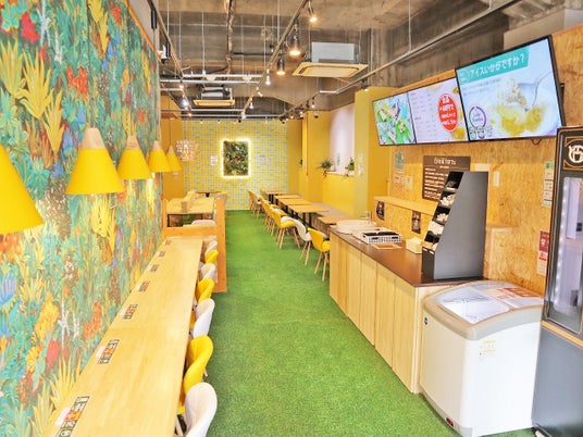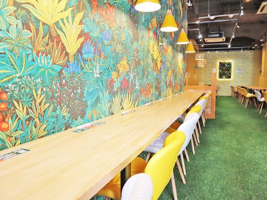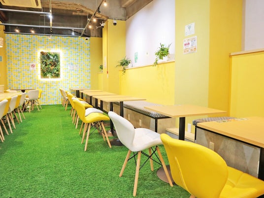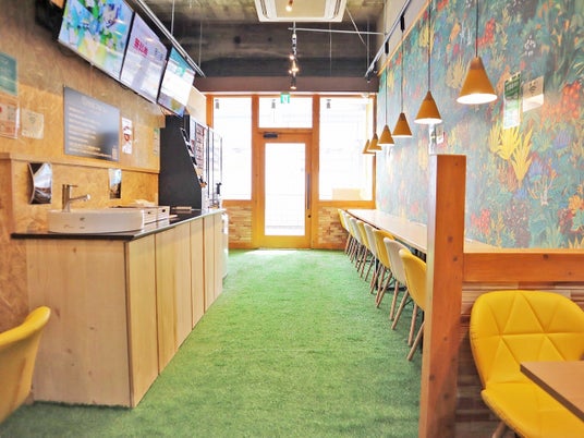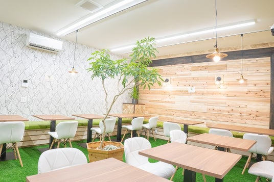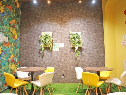 店内は緑あふれる癒され空間店舗の立地に合わせた壁紙・風景