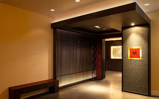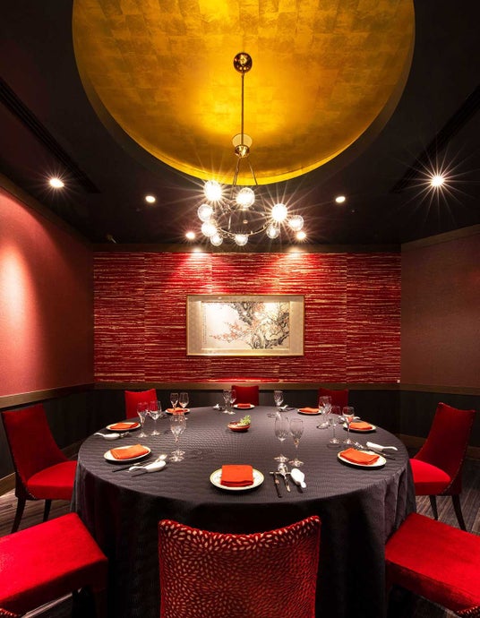 個室「四川」(金箔を押した天井から下がるモダンなシャンデリアに照らされ、落ち着いた赤色に包まれるシックな空間)