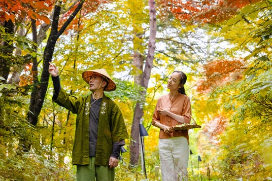 星のや軽井沢には、モミジやカエデ、ダンコウバイやヤマザクラなど、20種類以上の樹木や草花があり、秋になるとそれぞれ異なる色合いの紅葉が敷地内を彩ります。先ずは、植物の特徴や庭に対する想いなどを聞きながら、庭師と共に敷地内を巡る体験です。庭師と散策することで、自身では気づきえなかった視点で紅葉を観察するきっかけとなり、同時に自然が織りなす「彩り」の奥行きを感じられます。その後は、時間帯を変えて歩くことで、同じ紅葉でも光の差し込み具合によって僅かに色調が変化する様子に気づくことができます。到着時に提供する「こころの色手帖」に気づきを認めたり、落葉した葉を挟んでみたり、赴くままに色と向き合うことで、心の感度が高まりゆくひとときを過ごせます。