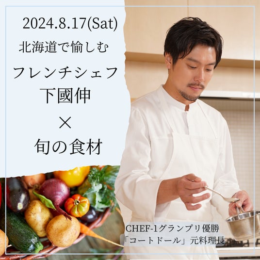北海道を代表する一流シェフの下國伸(しもくにのぶ)氏を迎え、北の大地が育む様々な旬の食材の収穫・採集体験や酒蔵見学を一緒に行います。1日の締めくくりには、ご自分で収穫した食材を使った下國シェフのフレンチコースをお楽しみ頂きます。あわせて地酒もご堪能ください。 年齢問わずお楽しみいただける1日限りの特別な体験をお届けします。