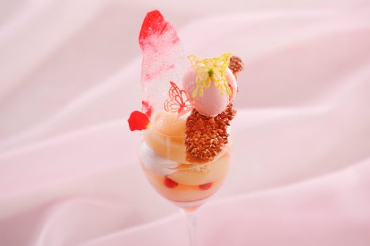 毎月テーマを替えてお届けするパルミエールのパフェ。7月のテーマは『桃』。トップには蝶のモチーフを配し華やかさを演出します。ジューシーな白桃を一個分使用したパフェは、白桃と相性の良いアールグレイのパンナコッタとキャラメル掛けのナッツがアクセント。食べ進めると上品な風味の白桃のリキュールのジュレ、バニラアイスクリーム、桃のピューレの層が楽しめます。見た目も優美で爽やかな夏を感じる季節のパフェをご堪能ください。