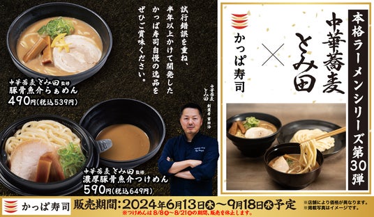 コロワイドグループのかっぱ寿司(カッパ・クリエイト(株) 本社:神奈川県横浜市、代表取締役社長:山角豪)は、2024年6月13日(木)より「本格ラーメンシリーズ」第30弾として、「中華蕎麦 とみ田」監修のつけ麺とラーメンの2品をかっぱ寿司全店にて販売いたします。