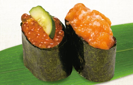 北海道産のいくらと紅鮭石狩漬けを贅沢に使用した軍艦寿司です。新鮮な海の幸を存分に味わえる贅沢な一品です。