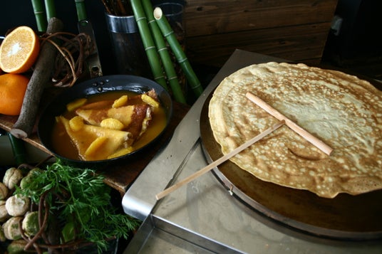 目の前でクレープ生地を焼いてくれ、柑橘のソースでお召し上がりいただけます。
