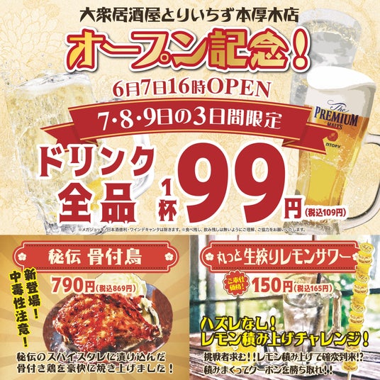 24年6月7日(金)16時「大衆居酒屋 とりいちず 本厚木店」が本厚木駅近くに新規オープン。オープンを記念して、6月7日(金)、8日(土)、9日(日)はオープン記念セール開催!何杯飲んでもドリンク1杯99円(税込109円)!誰でもお気軽にご利用頂けますのでこの機会にぜひご来店ください。
