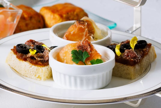 ヘーゼルナッツのクランブルで食感のアクセントを添えた「レモン香るメロンのタルト」は、あえて酸味をしっかり残したレモンと青肉メロンのすっきりとした甘みが調和した一品です。ドライクランベリーを忍ばせたショコラケーキに、甘さ控えめの白桃ジュレとホワイトチョコレートムースを重ねた「ホワイトチョコレートと桃のムース」や、キャラメリゼした桃のほどよい苦みが引き立つ「桃とバニラのマカロン」など、ジューシーな甘みが口いっぱいに広がるスイーツが3段のティースタンドに並びます。