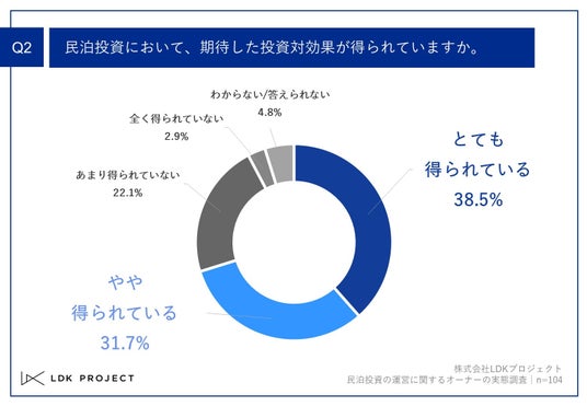 「Q2.民泊投資において、期待した投資対効果が得られていますか。」(n=104)と質問したところ、「とても得られている」が38.5%、「やや得られている」が31.7%という回答となりました。