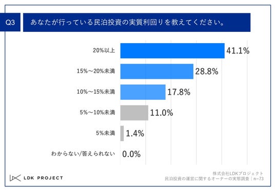 Q2で「とても得られている」「やや得られている」と回答した方に、「Q3.あなたが行っている民泊投資の実質利回りを教えてください。」(n=73)と質問したところ、「20%以上」が41.1%、「15%~20%未満」が28.8%、「10%~15%未満」が17.8%という回答となりました。