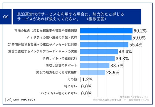 Q7で「とてもある」「ややある」と回答した方に、「Q9.民泊運営代行サービスを利用する場合に、魅力的だと感じるサービスがあれば教えてください。 (複数回答)」(n=83)と質問したところ、「市場の動向に応じた稼働率の管理や価格調整」が60.2%、「クオリティの高い清掃の手配・代行」が59.0%、「24時間体制でお客様への電話やメッセージに対応」が55.4%という回答となりました。