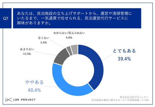 「Q7.あなたは、民泊施設の立ち上げサポートから、運営や清掃管理にいたるまで、一気通貫で任せられる、民泊運営代行サービスに興味がありますか。」(n=104)と質問したところ、「とてもある」が39.4%、「ややある」が40.4%という回答となりました。