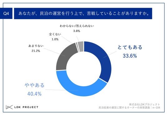 「Q4.あなたが、民泊の運営を行う上で、苦戦していることがありますか。」(n=104)と質問したところ、「とてもある」が33.6%、「ややある」が40.4%という回答となりました。