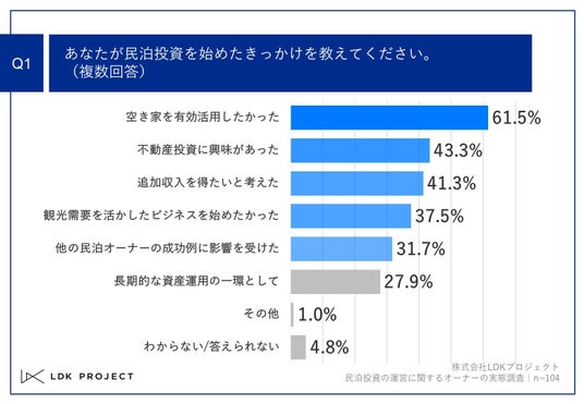 「Q1.あなたが民泊投資を始めたきっかけを教えてください。(複数回答)」(n=104)と質問したところ、「空き家を有効活用したかった」が61.5%、「不動産投資に興味があった」が43.3%、「追加収入を得たいと考えた」が41.3%という回答となりました。
