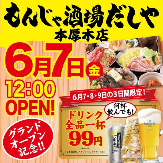 さらに、オープンを記念して6月7日(金)8日(土)9日(日)の3日間限定で、ドリンク全品を99円(税抜/109円税込)で提供する特別キャンペーンを行います。この期間中は、多くのお客様に「もんじゃ酒場だしや本厚木店」を体験していただくため特別価格でご案内いたします。