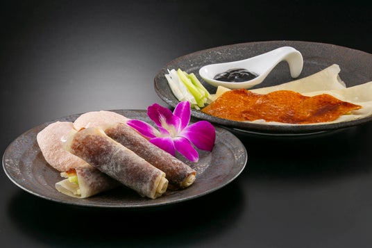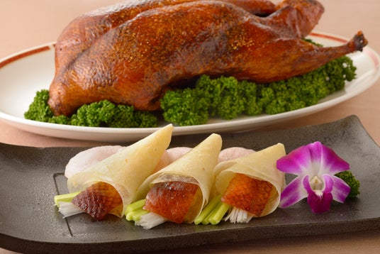 中国の南北朝時代に宮廷料理として始まったとされ、味付けした合鴨をまるごと焼き上げ、パリパリの皮をパンや薄い生地で巻いて食べる中国料理の代表的なメニュー。