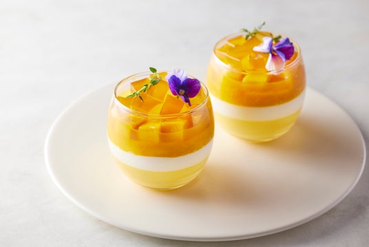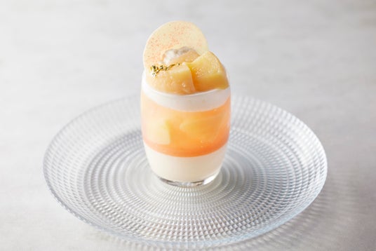 マンゴープリンとココナツムースを順に流し込んで美しい2層にし、フレッシュなマンゴーを乗せました。爽やかな香りのジャスミン茶のゼリーもトッピングした、夏に嬉しいさっぱりとしたプリンです。