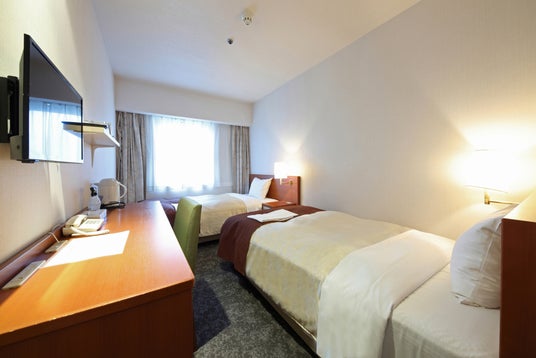 シングルベッド2台がL字型に並んだツインルームです。少し手狭ですが
