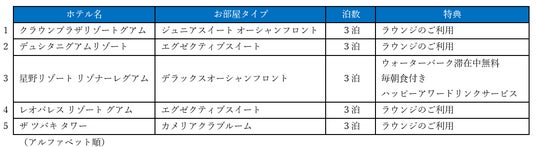 - 賞品:ユナイテッド航空ビジネスクラス往復航空券および以下ホテルの宿泊券をセットにして1組2名様ずつ、合計で5組10名様にプレゼント。
